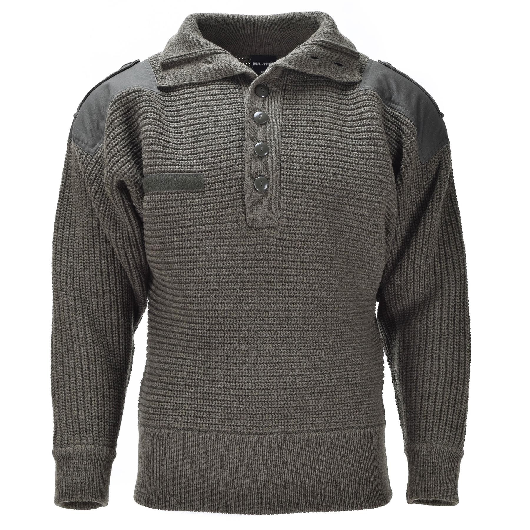 MIL-TEC Austrian Alpine military style sweater, made of high quality wool fabric, which helps to maintain warmth and comfort. Additional fabric reinforced elbows and shoulders to reduce rubbing and wear. High collar sweater, the neck closes with buttons, which helps protect against the wind and provides more warmth. Attach a name sticker to the chest with velcro. Functional and durable sweater for various activities. Features: Color: Olive green Made of wool fabric Reinforced elbows and shoulders with additional fabrics High collar Neck button fastening On the chest Velcro name tag
