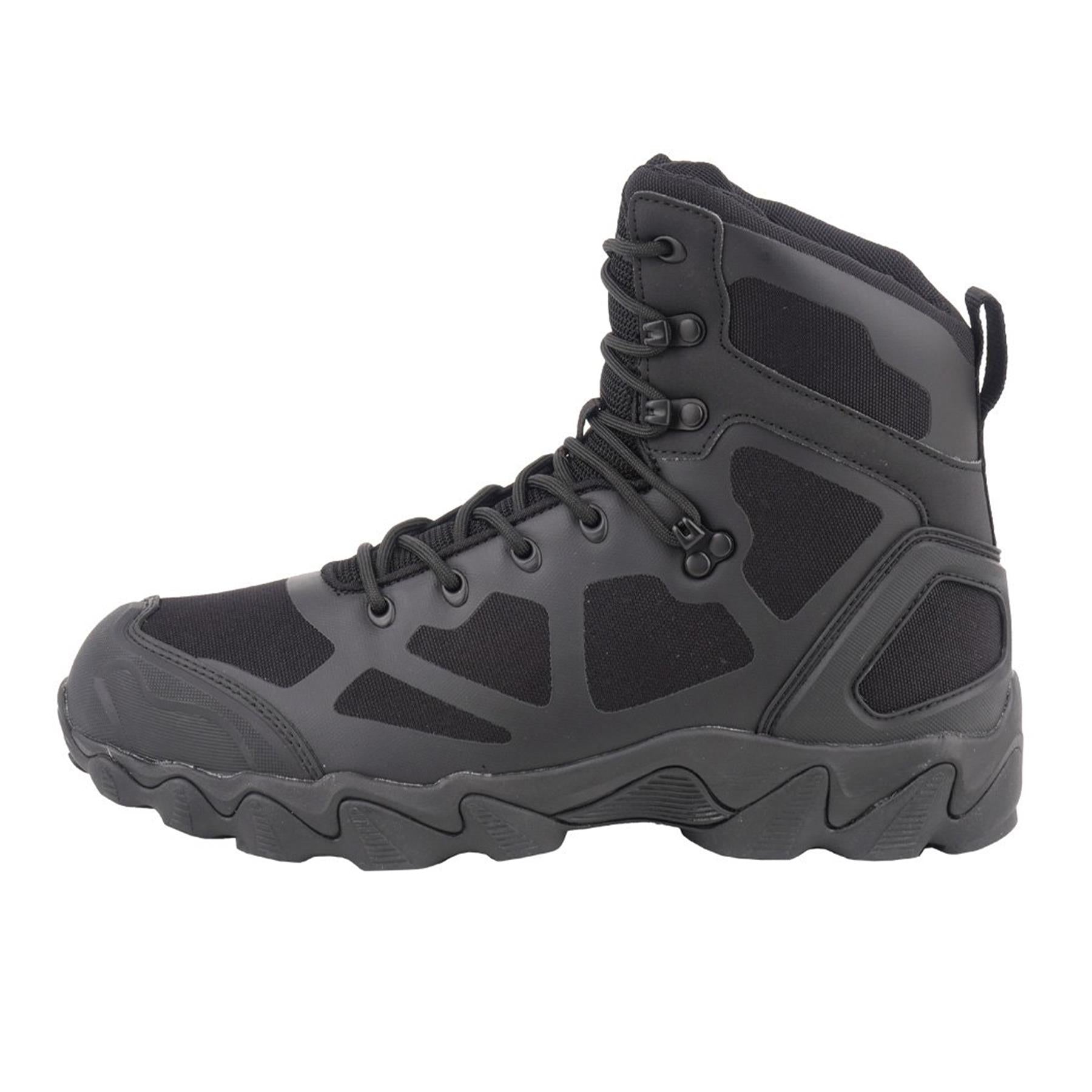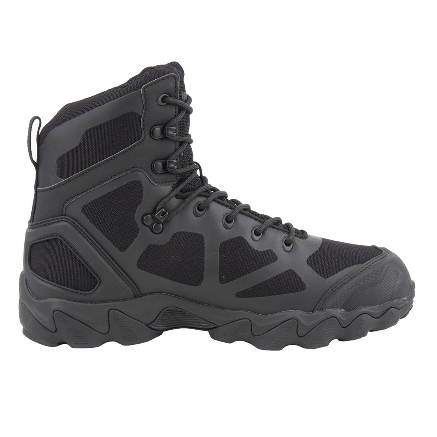 MIL-TEC brand Chimera boots are designed for combat service, hiking and other outdoor activities. They are made from a lightweight yet durable black fabric suitable for use in a variety of outdoor environments. Super comfortable, lightweight and breathable 7 inch long boots. The boots are designed to provide comfort and protection during intense activities, suitable for long marches or extended combat operations. The shoe is laced for a secure and comfortable fit and has an ankle support for stability during high-intensity movements. They also feature a non-slip sole construction that provides excellent traction on a variety of terrains and a reinforced toe cap for added protection against impacts and uneven terrain. Overall, MIL-TEC's Chimera boots are a reliable and durable choice for individuals who need a high-quality shoe that can withstand the rigors of outdoor activities. They provide maximum protection and comfort to the wearer without sacrificing mobility and dexterity.