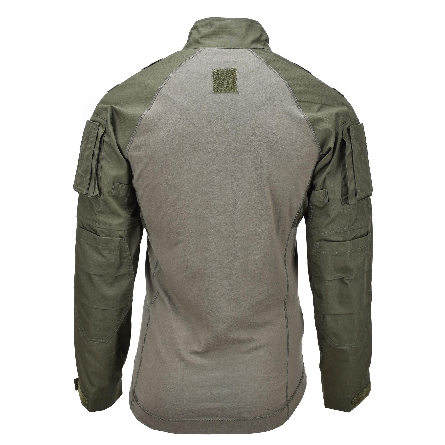 MIL-TEC combat shirt military style shirt. The chest and back are made of soft and light cotton fabric (100% cotton) that does not restrict movement, the sleeve collar and shoulders are sewn from a polycotton mixture (65% polyester and 35% cotton). The mesh material under the armpits is mesh which provides good air ventilation. Chin guard. Elbows reinforced with additional fabric. There are loops on the sleeves for additional equipment. Two zippered pockets on the sleeves to put your phone, documents or other important items. Adjustable cuffs with velcro straps. Features: Color: Olive Green For use under a tactical vest Moisture wicking Reinforced sleeve elbows Zippered sleeve pockets Adjustable sleeves Made of cotton and polyester.