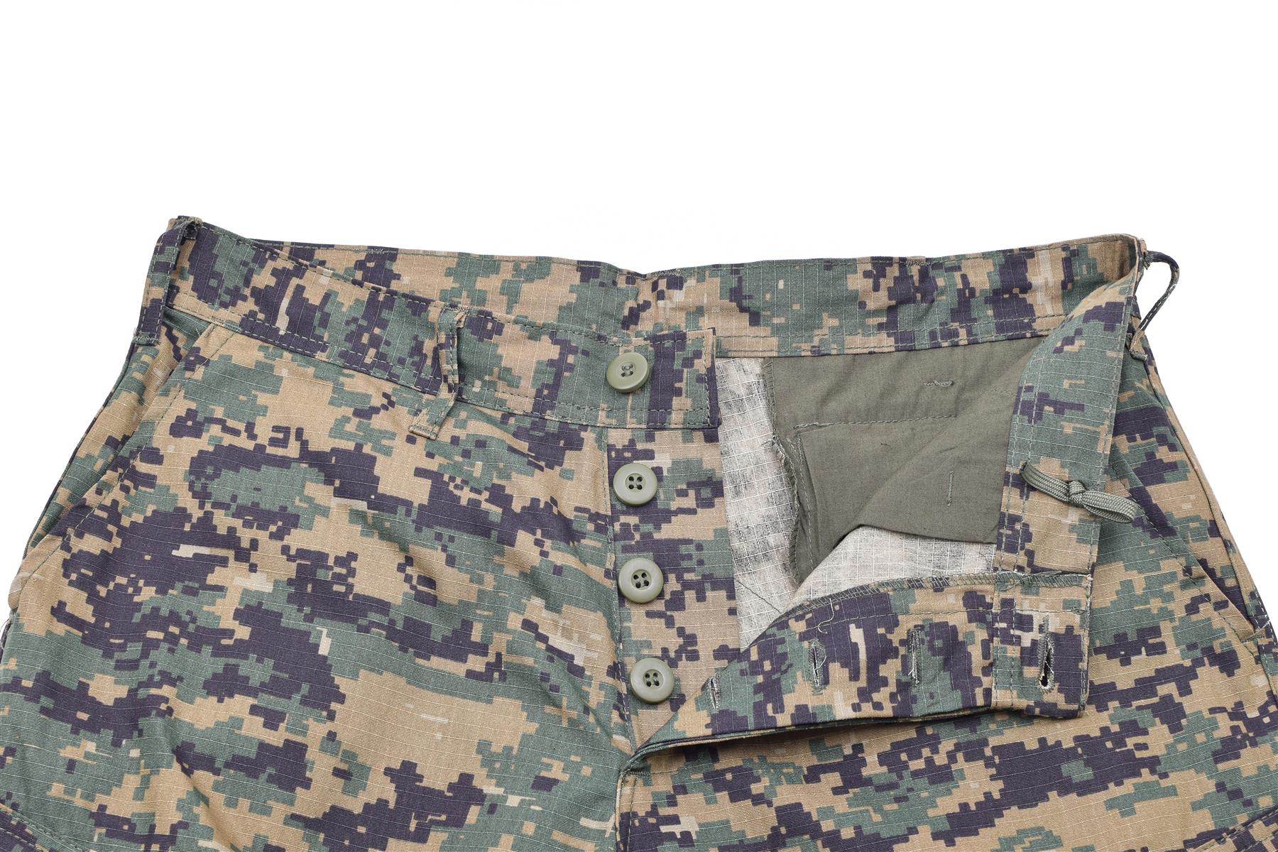US Army-Style Digital Woodland Camo Pants by Mil-Tec brand Mil-Tec - durable outdoor military pants. Prepare for outdoor adventures with Mil-Tec's US Army-Style Digital Woodland Camo Pants, designed for outdoor durability and functionality. These outdoor army pants feature a rugged design inspired by military standards, making them ideal for outdoor activities, hiking and more. Ripstop construction: These pants are made of ripstop fabric, so they are resistant to wear and tear to withstand the toughest challenges of your hikes. Adjustable waist and hem: Adjustable waist and lower cuffs ensure comfort and adaptability for a variety of activities. Reinforced knee protectors: Pants with reinforced knee protectors provide extra protection and durability, making them ideal for rugged terrain and demanding tasks. Care: These pants are easy to care for as they are machine washable, so you can keep them clean and ready for your next adventure with minimal effort. Pockets: With a wide variety of pockets, including two side pockets, two cargo pockets, two back pockets and two leg pockets with zips and loops, these pants have plenty of room to store your gear and personal items, adding to their utility. Style: These pants are cargo pants, so they're both functional and have a classic military-inspired look.