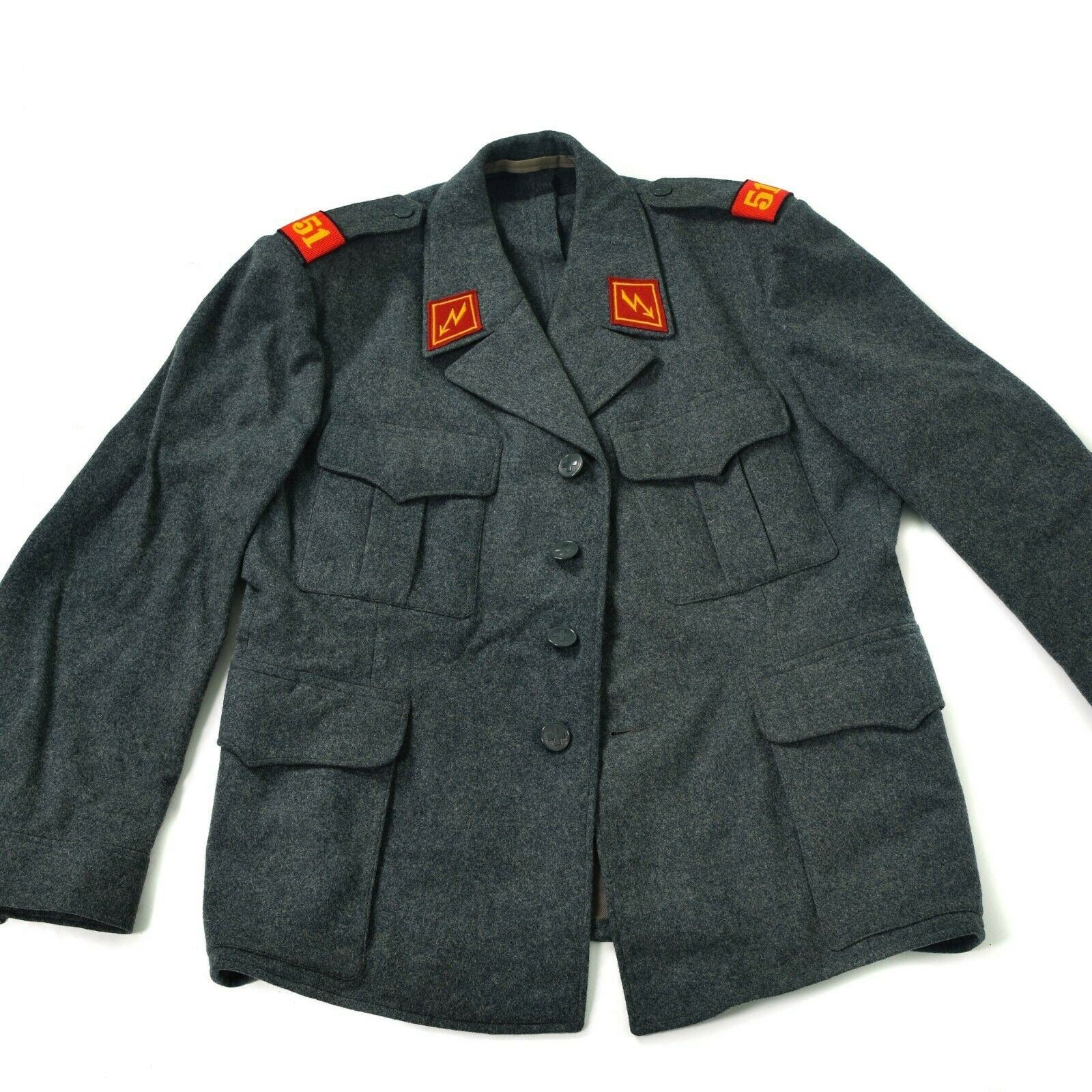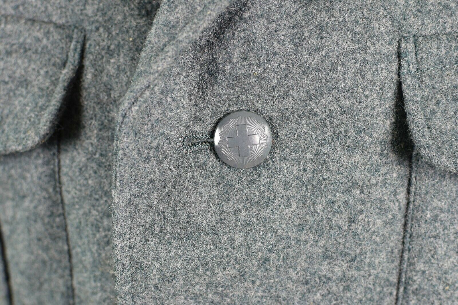 The vintage Swiss Army official jacket is a woolen gray garment. The jacket has chest and side pockets, so it has enough space to store small items. The buttons of the plastic jacket are decorated with the emblem of the Swiss cross, which is the symbol of the Swiss Confederation. The jacket is of a formal style, most likely intended for military use during official events or ceremonies. The wool material makes the jacket warm and durable, suitable for use in colder climates. Overall, this vintage military jacket from Switzerland is a unique and stylish item that combines functionality and tradition.