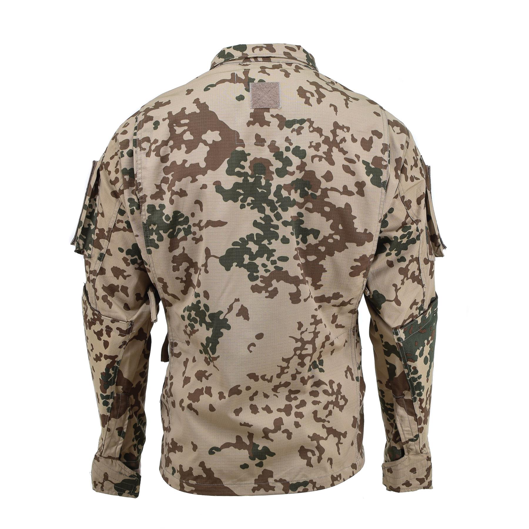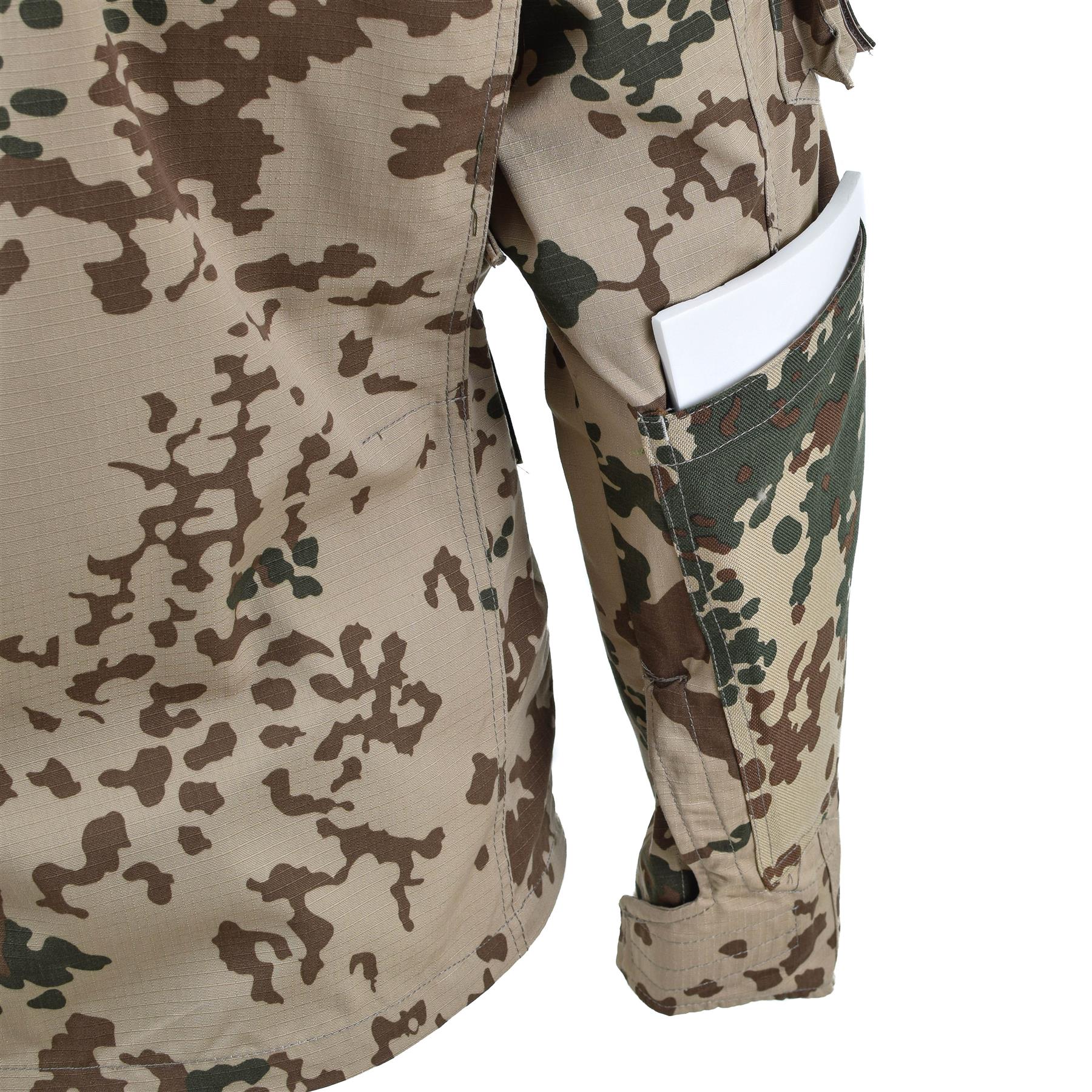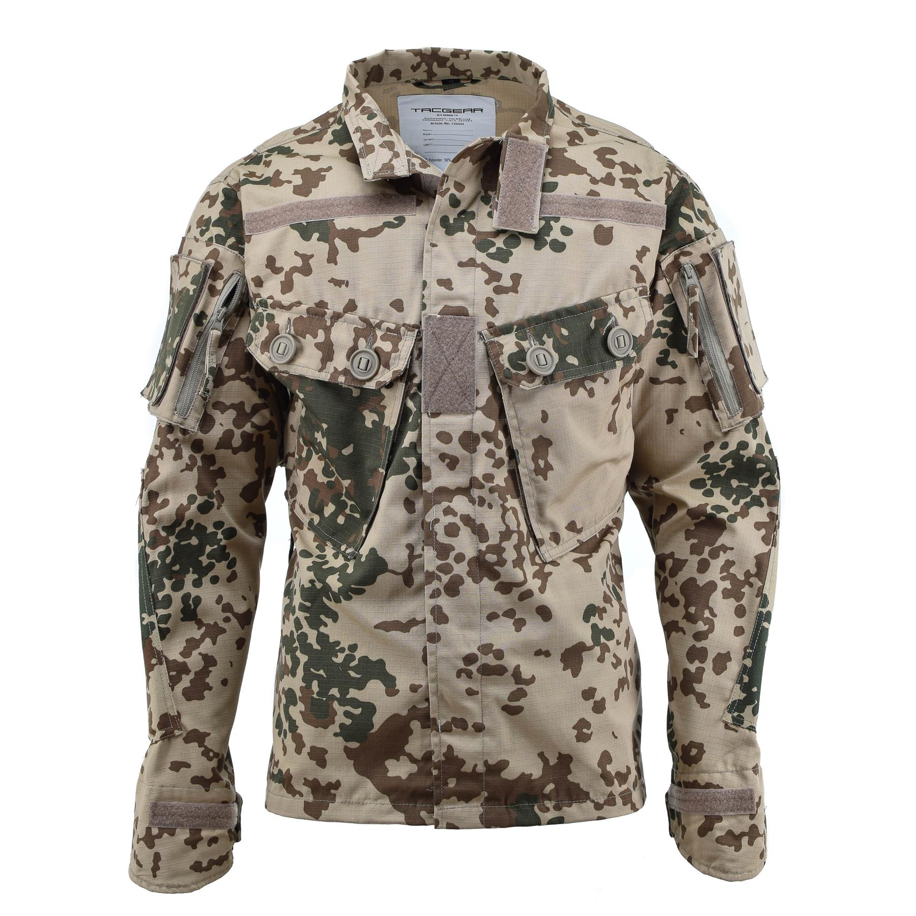 TACGEAR commando flecktarn camo jacket, made of strong and durable Rip-Stop material (50% cotton and 50% polyester), high quality jacket made of light and durable fabric. Two zipped chest pockets and two sleeve pockets to store your essentials. Adjustable cuffs and collar. Extra fabric reinforced elbows. The high collar provides additional wind protection. Velcro straps on the chest. Features: Color: Flecktarn camo Made of Rip-Stop fabric (50% cotton and 50% polyester) Two snap chest pockets Two sleeve pockets Adjustable cuffs High adjustable collar Reinforced elbows Velcro straps