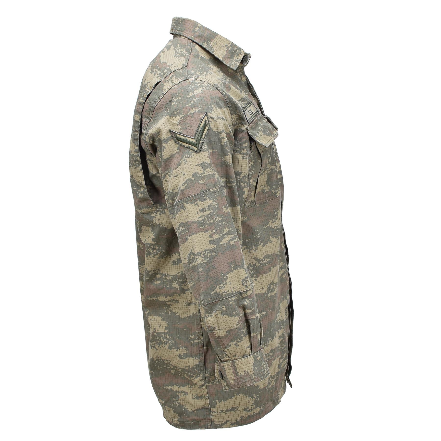 Original Turkish army desert camo tactical shirt. The Turkish tactical shirt is made of breathable, light and durable Rip-Stop fabric (100% cotton). Rip-stop fabric perfectly protects against tearing. The jacket and the cuffs of the jacket are fastened with buttons so that we can adjust the jacket according to ourselves. Two front chest closed pockets to store the most important items. Reinforced elbows with extra fabric help protect against wear and tear and provide extra elbow protection. The desert camo model is adapted for sand and desert environments. Features: Color: Desert camo Material: Rip-Stop (cotton) Adjustable cuffs The jacket closes with buttons Two closed chest pockets to store the most important things. Reinforced elbows